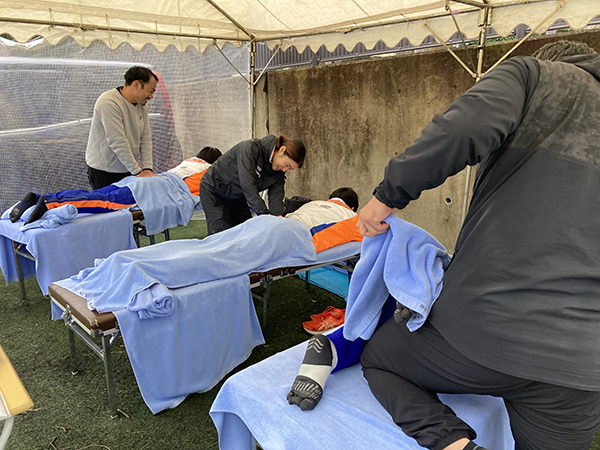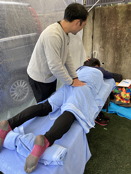 競技が終了した選手が、競技での疲労や、日頃の痛みなどについて施術を受ける為に、ブースに来てく