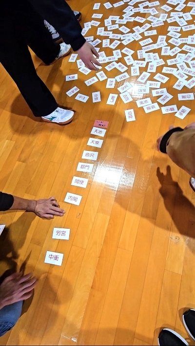 約400枚の「経穴かるた」を用いたゲームで、学年ごとに合わせた問題が出され一斉に取りに行きます。得点が倍になるボーナスかるたなど、運と実力が試される展開となりました。