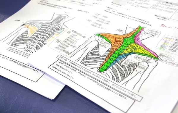 それから実際に身体を触診します。触診する際は、その筋肉の起始・停止・作用を踏まえて動かして確認します。そこまでできたら鍼を打ちます。