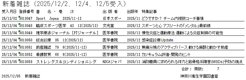 トップ 図書室 図書室からのお知らせ 新着雑誌のお知らせ(2025/12/2、12/4、12/5受入)