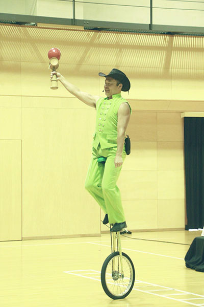 一輪車の上で披露しているけん玉、重さはなんと2Kg以上!!